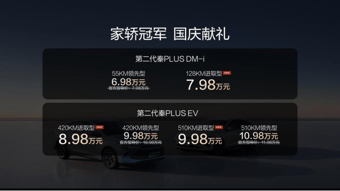 金秋九月,汽车市场迎来了一波颇具分量的新品浪潮。9月25日,第二代秦PLUS双车上新,包括秦PLUS DM-i 128KM进取型、秦PLUS EV 420KM进取型和510KM进取型。更为引人注目的是,同步启动了“国庆献礼价”限时活动,使得这款累计销量已突破150万辆、连续两年蝉联家轿销量冠军的车型,起售价下探至6.98万元。这不仅是一份献给消费者的国庆厚礼,更是比亚迪在夯实市场领先地位的同时,对A级家轿价值体系的又一次强力重塑。